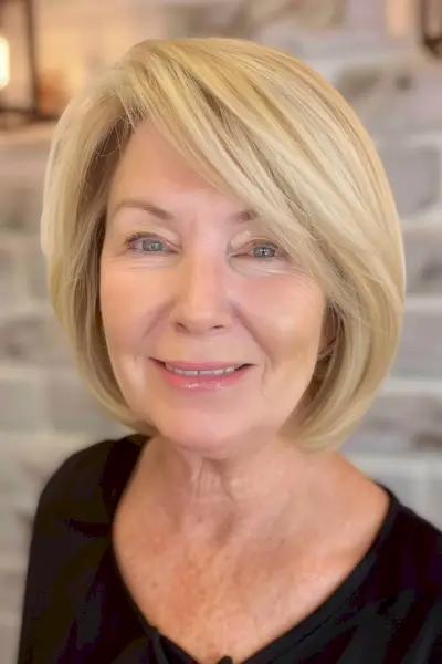 Ce BOB court avec une frange à balayage latéral est parfait pour les femmes de plus de 60 ans à la recherche d'un style doux et framming. La coupe présente des couches subtiles qui ajoutent du volume et du mouvement, ce qui la rend idéale pour les cheveux fins à moyens. Les tons blonds chauds améliorent la lueur naturelle de la peau, tandis que la frange à balayage latéral offre une apparence jeune en couvrant doucement les lignes du front. Cette coiffure chic mais à faible entretien est idéale pour ceux qui veulent un look poli et élégant avec un minimum d'effort.